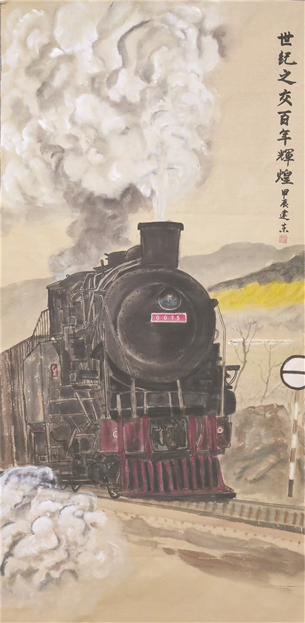 “鋼軌是橫平豎直的通途,藝術(shù)是曲徑通幽的修行?!眳墙|的藝術(shù)疆域遠不止方寸印石。在國畫(huà)領(lǐng)域,他以秦嶺山野為紙、鐵路元素為墨,獨辟蹊徑,形成獨樹(shù)一幟的風(fēng)格。