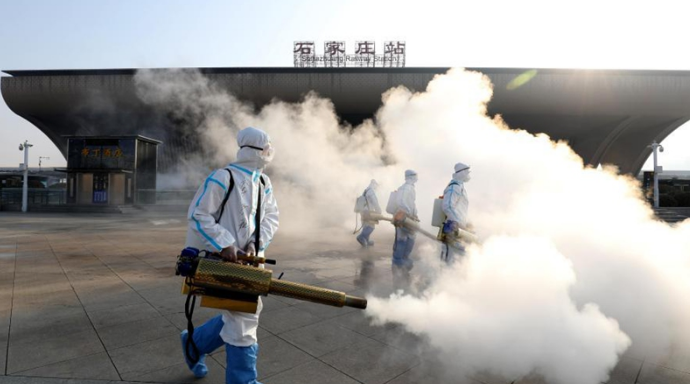Staff members disinfect the Shijiazhuang Railway Station West Square in Shijiazhuang, north China's Hebei province, Jan. 31, 2021. Local authorities have conducted disinfection work on key public areas such as Shijiazhuang Railway Station to prepare for the work resumption. (Photo by Liang Zidong/Xinhua)