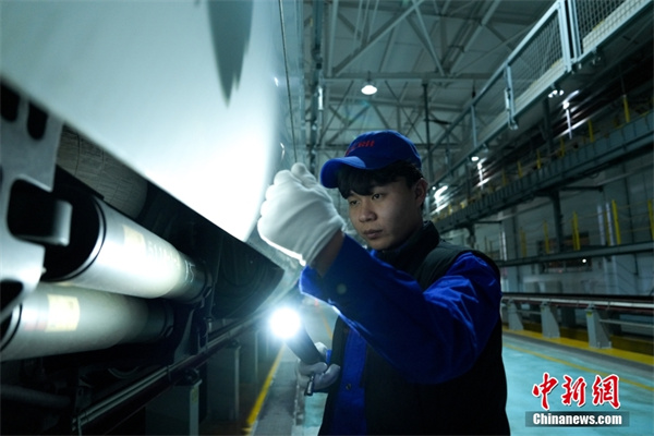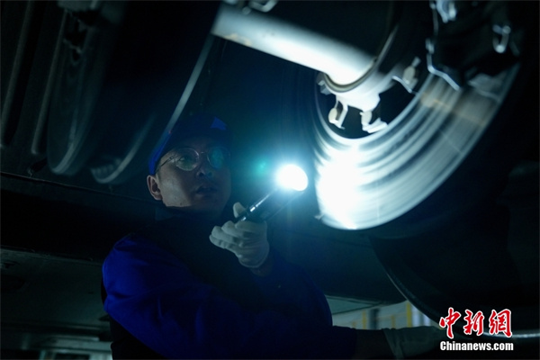 1月16日晚,在北京動(dòng)車(chē)段北京北動(dòng)車(chē)運用所,動(dòng)車(chē)組機械師對動(dòng)車(chē)組開(kāi)展側身檢查。
