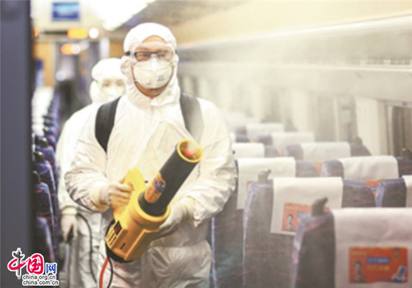 2020年2月5日,楊波在南昌開(kāi)往北京西D738次列車(chē)上進(jìn)行消毒作業(yè)。張學(xué)東 攝
