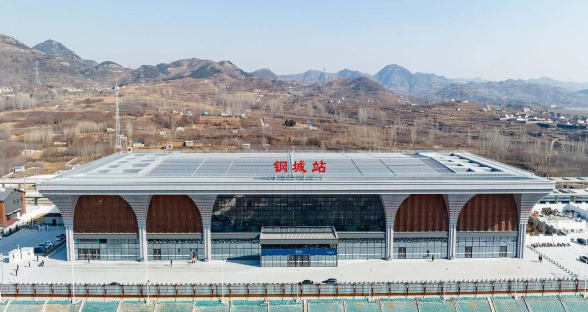鋼城站位于濟南市鋼城區主城區東部,緊鄰牟汶河生態(tài)帶和S234省道,距離鋼城區最主要的產(chǎn)業(yè)中心萊鋼產(chǎn)業(yè)區3.2公里,隸屬中國鐵路濟南局集團有限公司,于2022年12月開(kāi)通運營(yíng)。站房建筑面積為9918平方米,候車(chē)面積5090平方米。實(shí)行“驗檢合一、售服合一、進(jìn)出合一”客運組織模式。站房地上一層,地下一層。站房在設計上采用“錚錚鐵骨,熱情鋼城”的設計理念,以富有張力的傘狀鋼結構造型,結合力量感厚重感的鋼鐵巨柱,支撐鋼結構屋檐,充分展示現代鋼城特色風(fēng)貌。